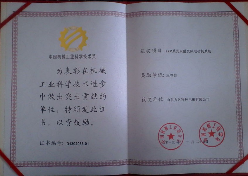 日前,山東力久特種電機有限公司從市科技局獲悉,由我公司研發完成的“TYP系列永磁變頻電動機系統”項目榮獲“2013年度中國機械工業科學技術獎”三等獎,這也是我市歷史上首次獲此殊榮。