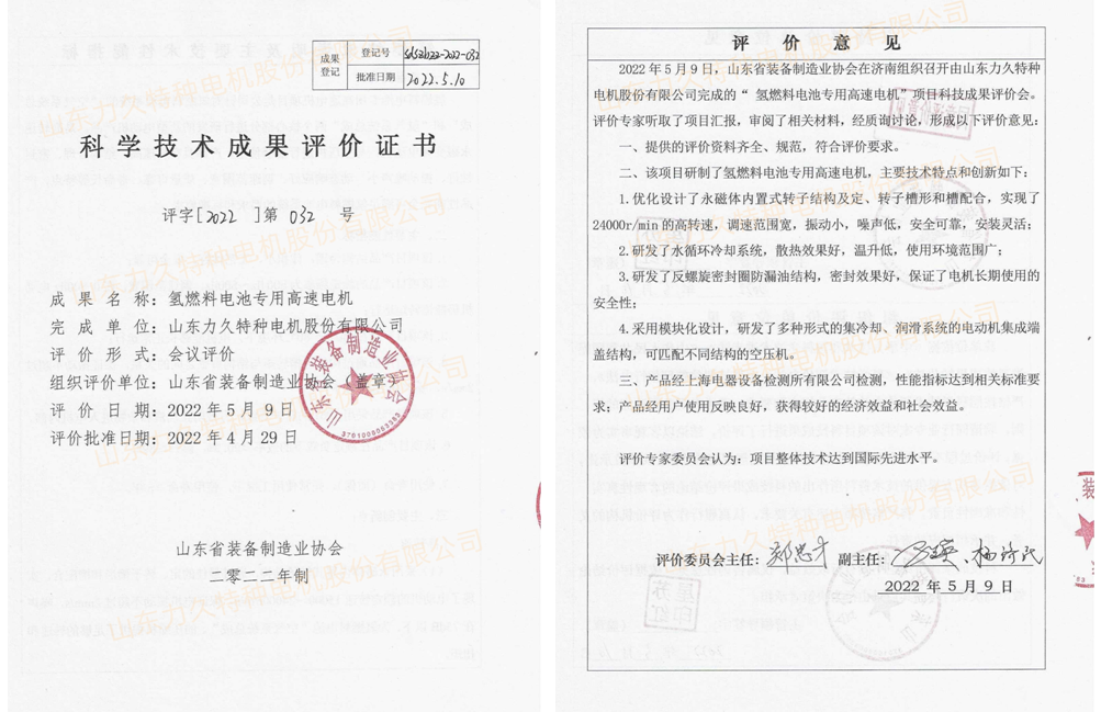 山東力久特種電機股份有限公司氫燃料電池專用高速電機項目轉速高、結構靈活、密封性好、振動噪聲小、動態響應好、調速范圍寬、質量可靠等,產品性能完全可滿足氫燃料電池系統的運行需求。本次評價提供的資料齊全、規范,符合評價規定,產品經上海電器設備檢測所有限公司檢測,性能指標達到相關標準要求,產品經用戶使用反應良好,獲得較好的經濟效益和社會效益。