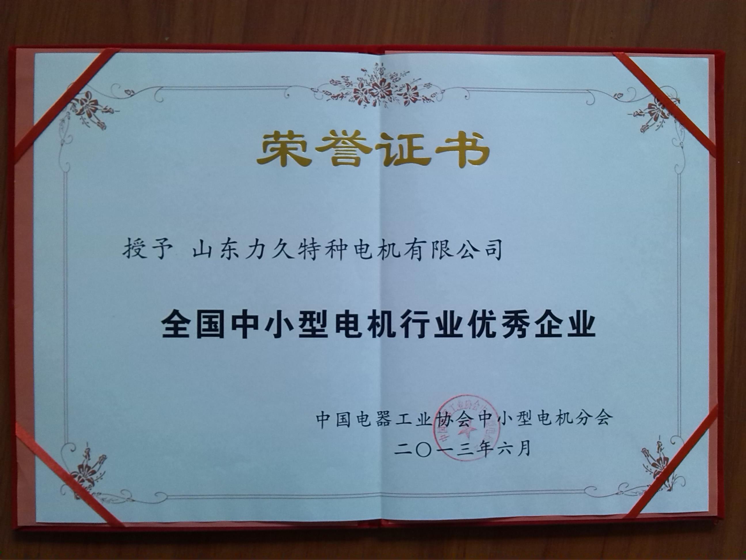 山東力久電機公司被授予“全國中小型電機行業優秀企業”稱號